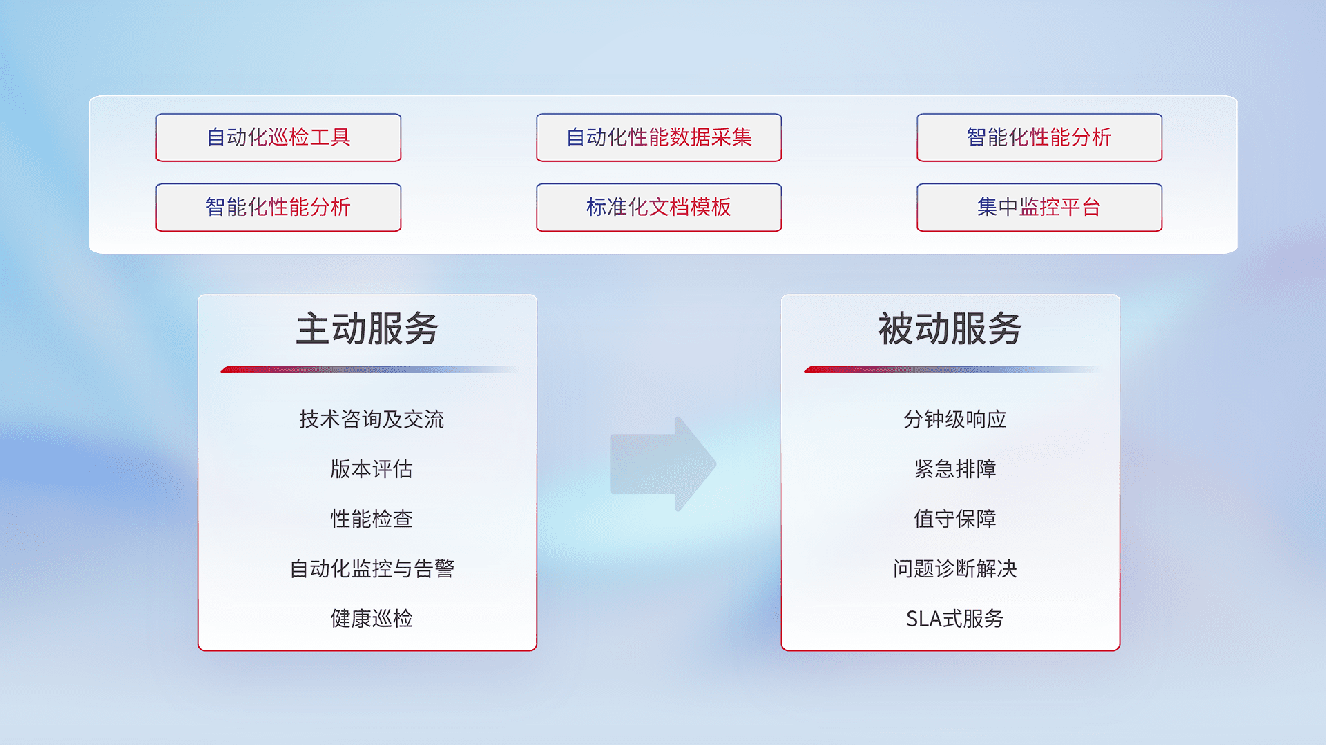 智能化工具和标准化文档,,,保障服务质量,,提供主动服务(包含技术咨询、、、、版本评估、、、、性能检查、、自动化监控与告警、、健康巡检)和被动服务包含(分钟级响应、、、紧急排障、、值守保障、、问题诊断解决、、、、SLA服务)。。。