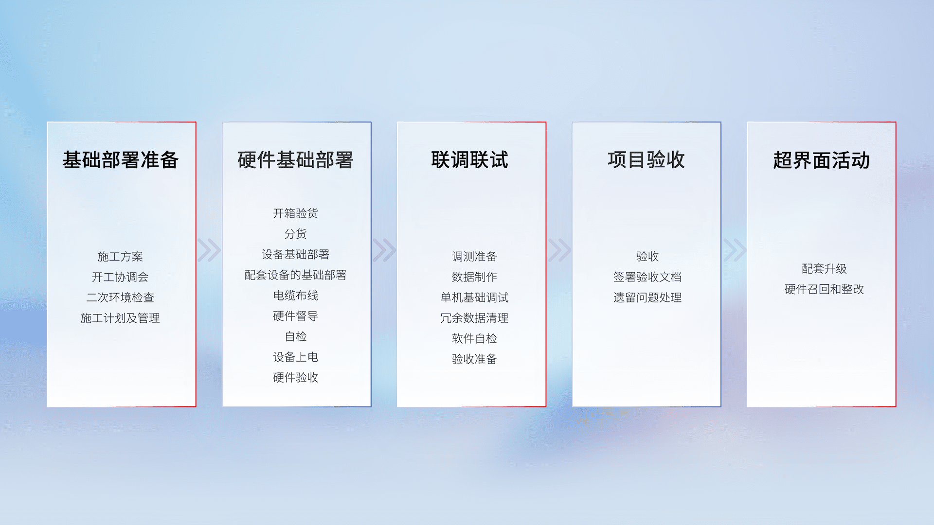 从基础部署准备、、、硬件基础部署、、、联调联试、、项目验收、、、越界面活动的全过程可追溯,,保证施工质量和进度。。。