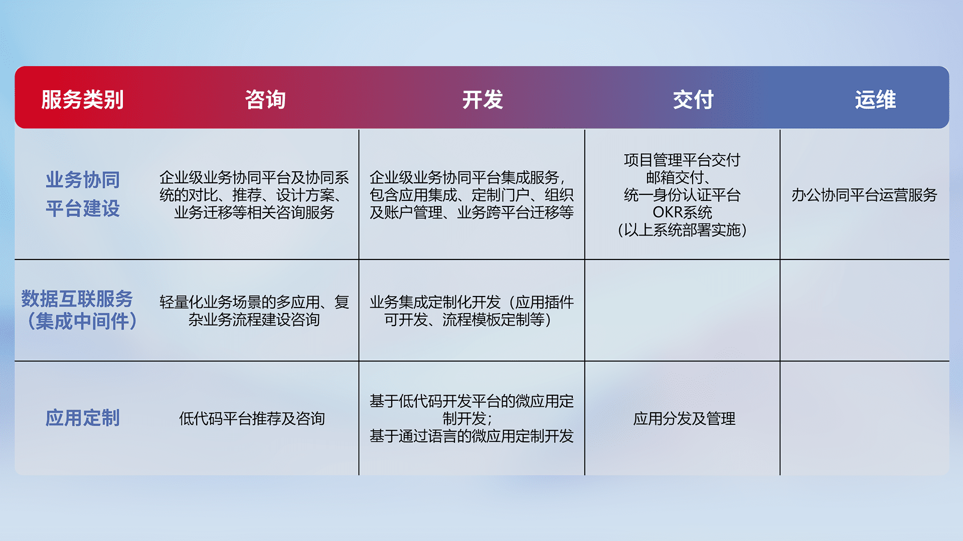 针对钉钉、、企微、、IDaas等平台级产品提供产品的规划、、方案、、交付、、、定制化开发等服务,,,实现如统一协同办公、、、、智能客户服务、、混合会议管理、、、、智能数据查询、、、、等业务场景,,,实现数字化转型。。。。